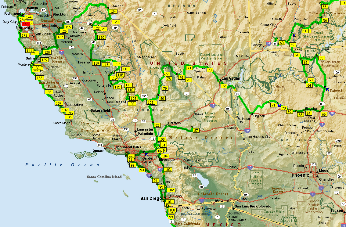 Ahhh, el mapa, ese trozo de pergamino, con una cruz en el lugar del tesoro, porque así lo seguimos pensando, por más que exista Google Maps y tengamos receptores GPS hasta en las neveras, es lo primero que deseamos consultar en una web de viajes. Las fronteras nos encantan, cuando nos dejan cruzarlas, claro. Ponemos a vuestra disposición tanto un fichero con el recorrido muy detallado, para abrir con Microsoft Streets & Trips, como la ruta que a grandes rasgos recorrimos y, sobre todo, el itinerario (con lugares de interés) y el mapa de la ruta 66 original. Imprescindibles.
